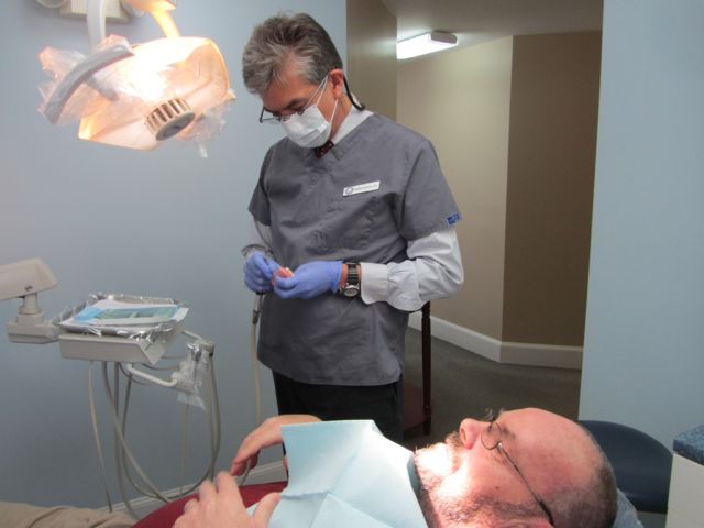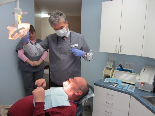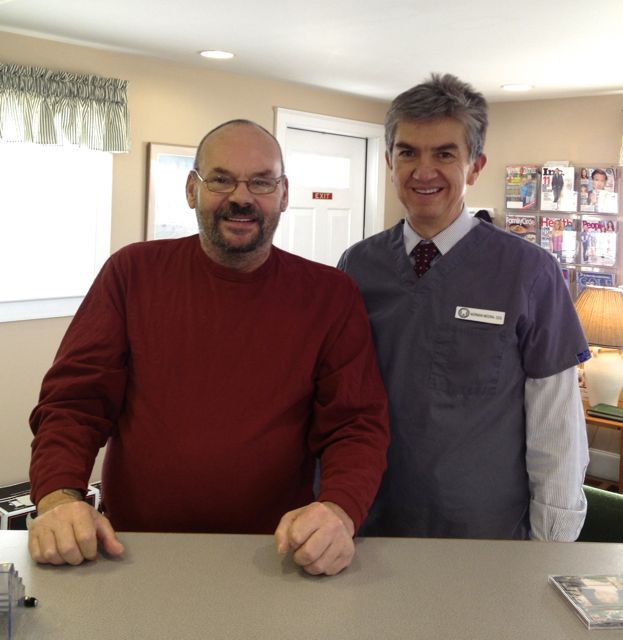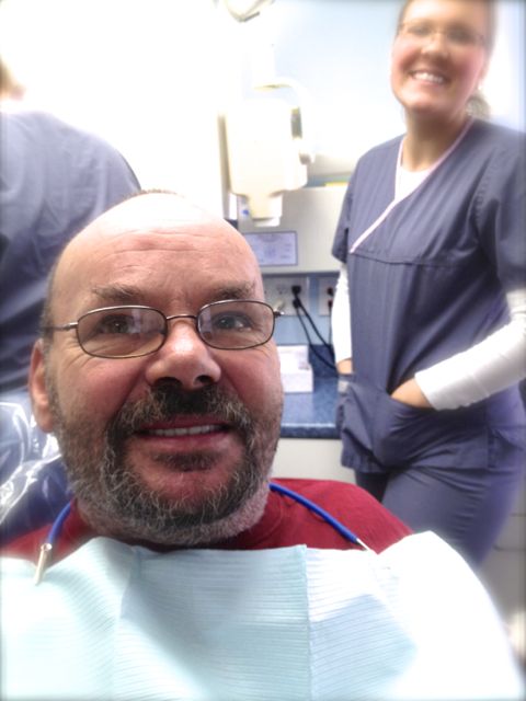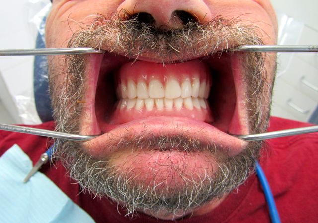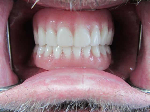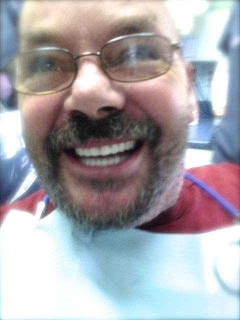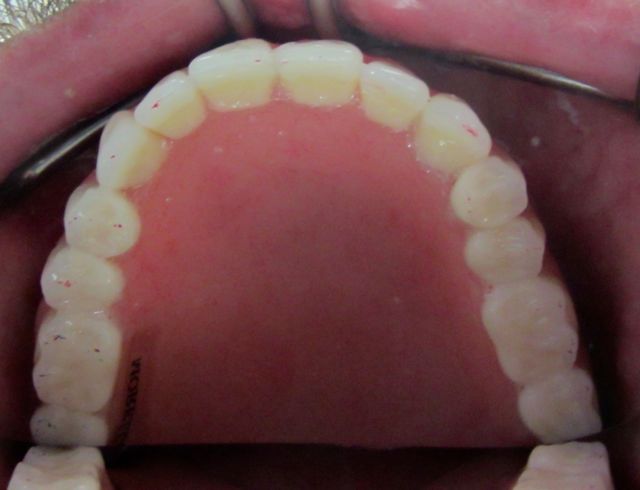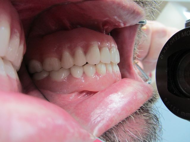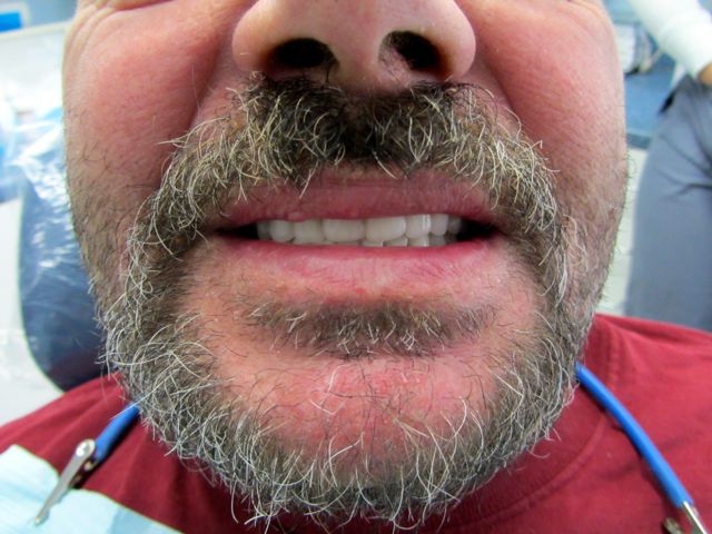 The final dentures are back from Eliason Dental Lab and boy, do they look great! The dentures go in a little tight. Mike liked the idea of leaving them tight, and I agreed, knowing that I would see him in 24 hours for the routine denture check when we could start adjusting out the sore spots. Unfortunately, because of transportation issues we were not aware of, Mike was not able to come in for another week. I think it was a long sore week for him. If I had known about his transportation issues, I would have done things differently.