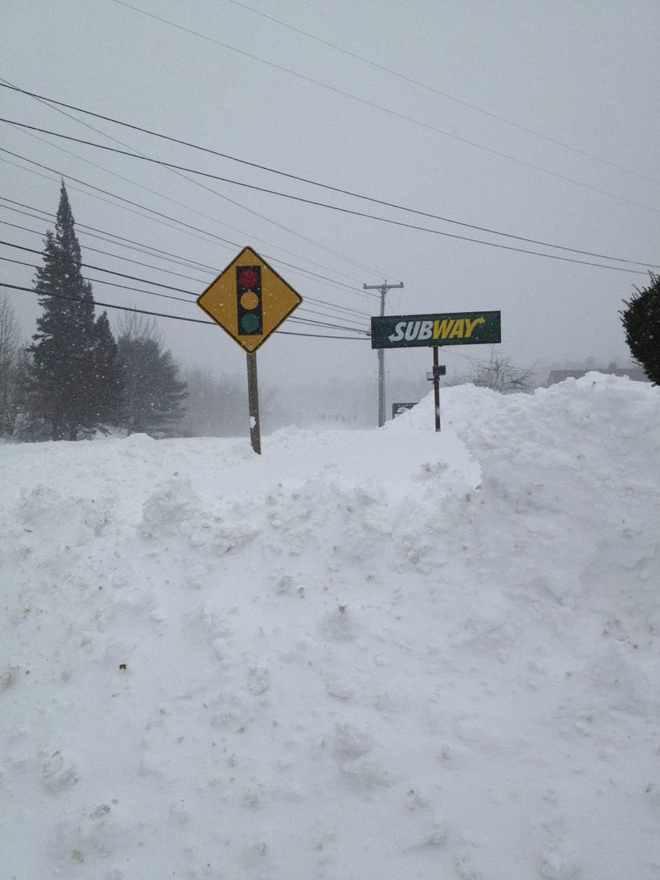 Subway sign in Camden Maine. Tons of snow from blizzard, Nemo.