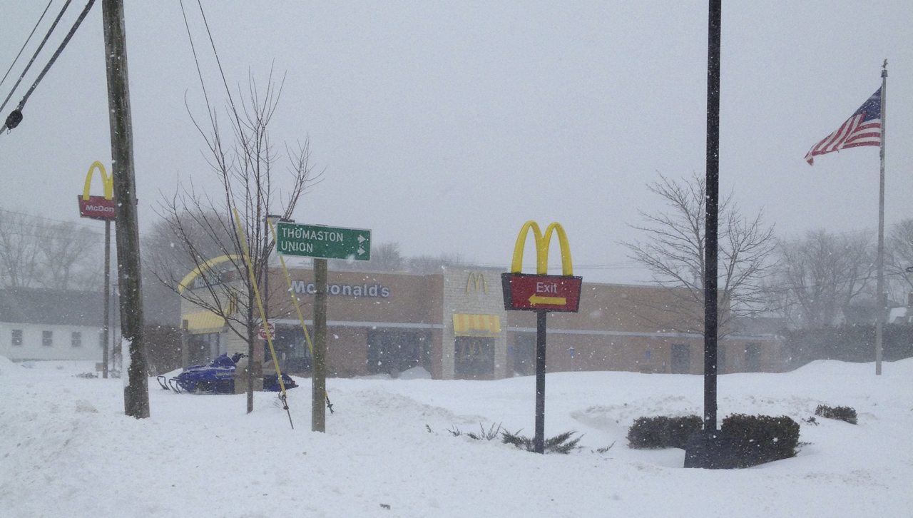 McDonalds in Rocland Maine was closed due to the blizzard, Nemo. No cars, but there are snowmobiles – a good way to get around during a storm like this one.